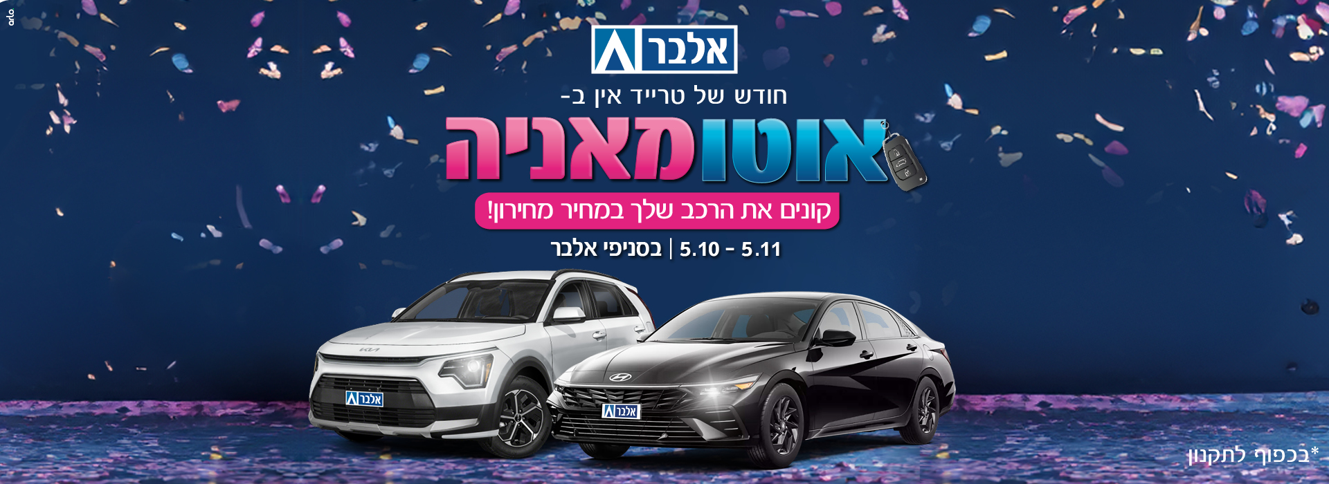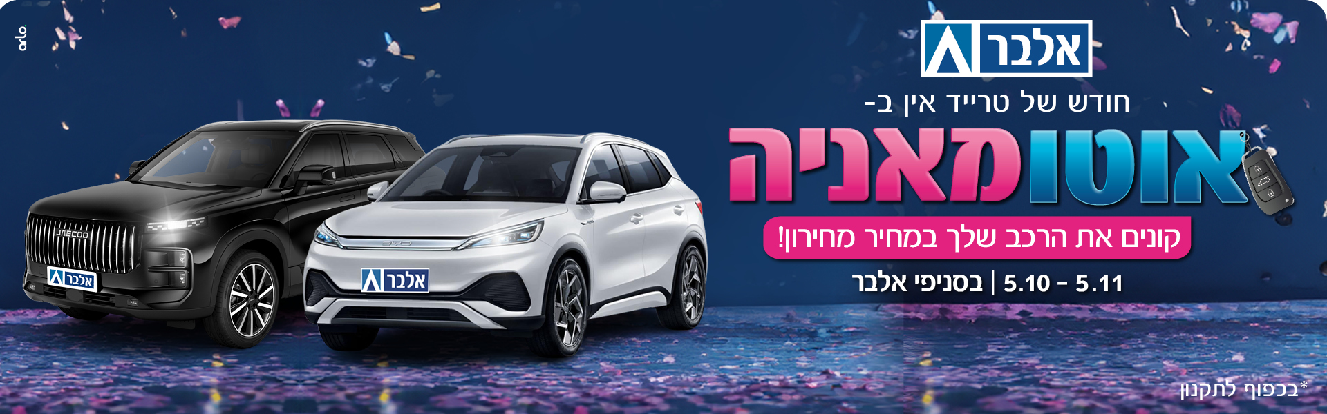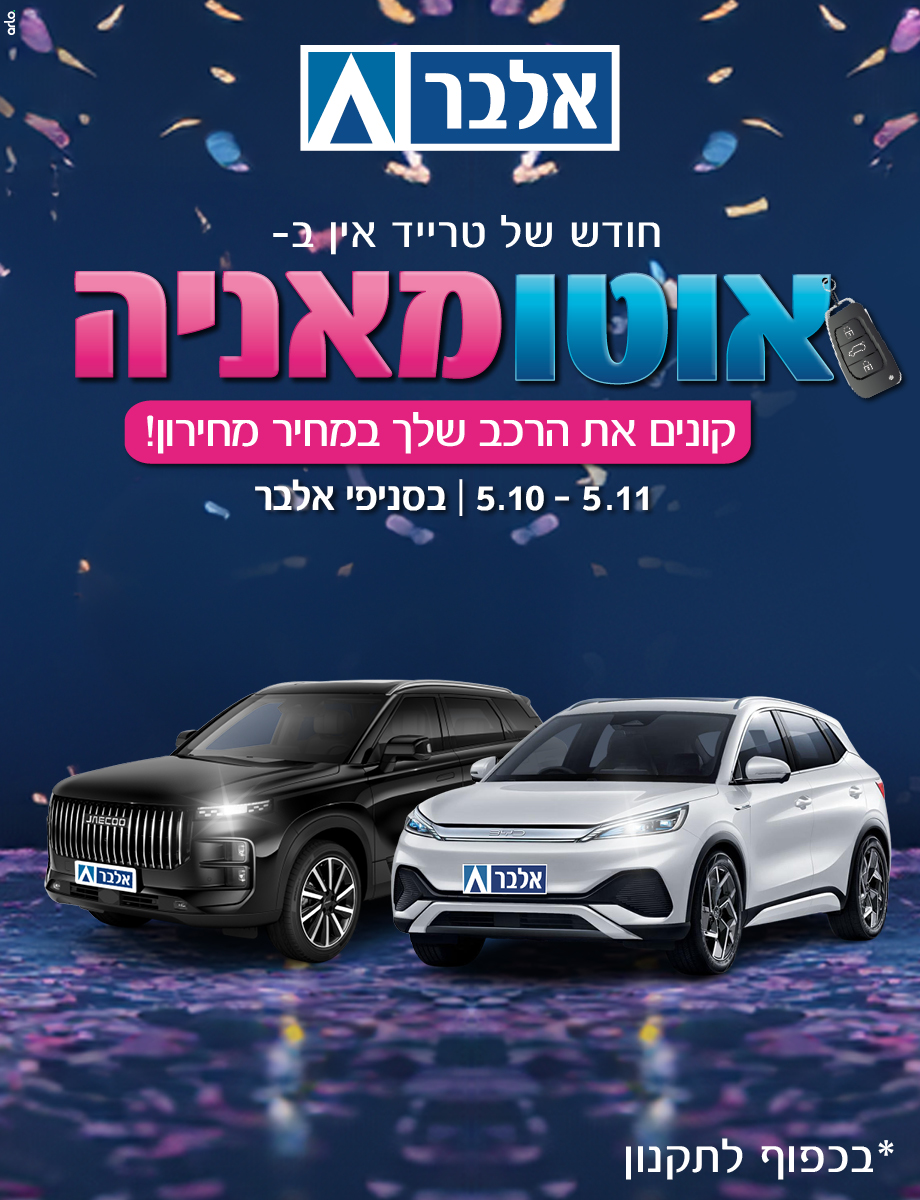 בין התאריכים 5.10.25 ל5.11.25 רכישת הרכב הישן במחיר מחירון חלה על רכבים מסוימים העומדים בתנאים מסוימים והכל בכפוף לתנאים המפורטים בתקנון הפעילות המופיע באתר אלבר - www.albar.co.il וההסכם; התמונות להמחשה בלבד; אלבר תהיה רשאית להפסיק את הפעילות במועד מוקדם יותר ללא צורך במשלוח הודעה בעניין; מימון כפוף לאישור ההלוואה על ידי המלווה, אלבר קרדיט מע"מ מ.ר 54930 , ולתנאי הסכם ההלוואה; אי-עמידה בפירעון ההלוואה עלול לגרור חיוב בריבית פיגורים והליכי הוצאה לפועל; ההפניה לחברת ביטוח תעשה על ידי אלבר סוכנות לביטוח (2016) מע"מ.