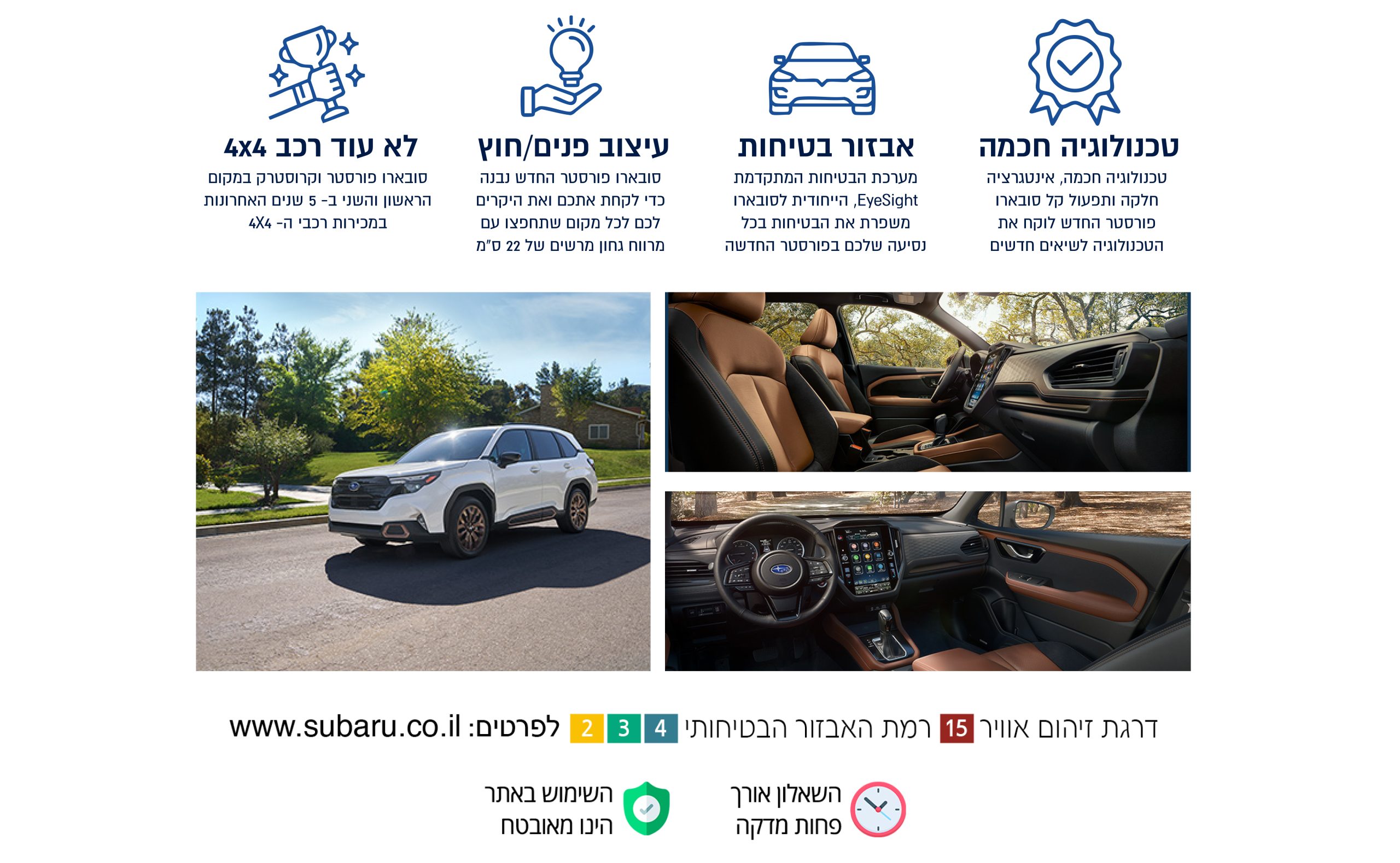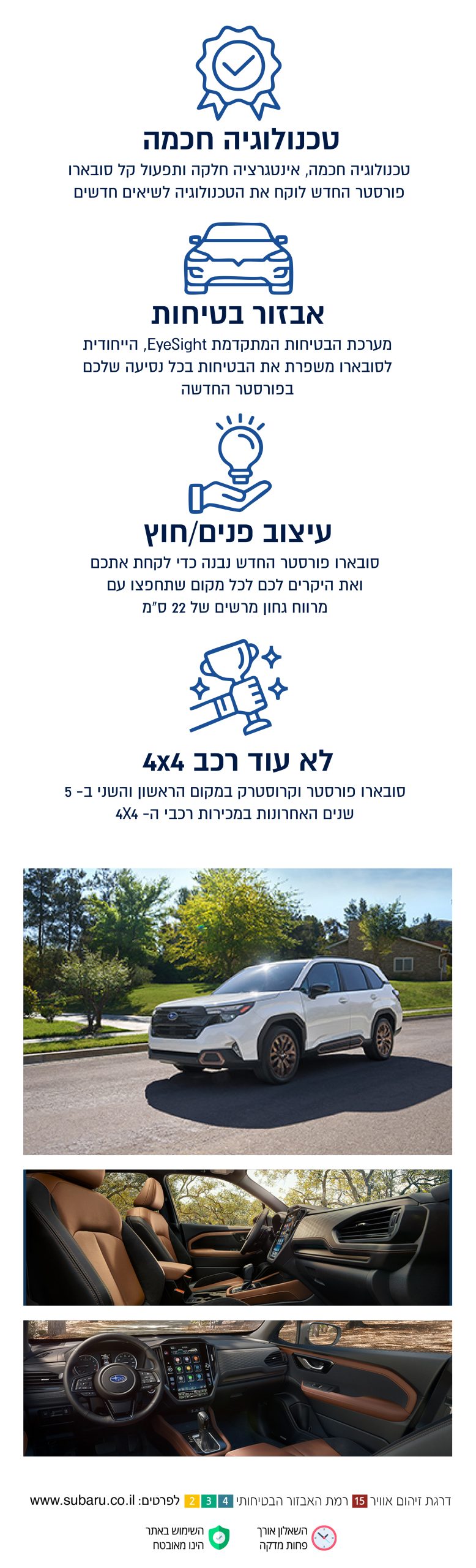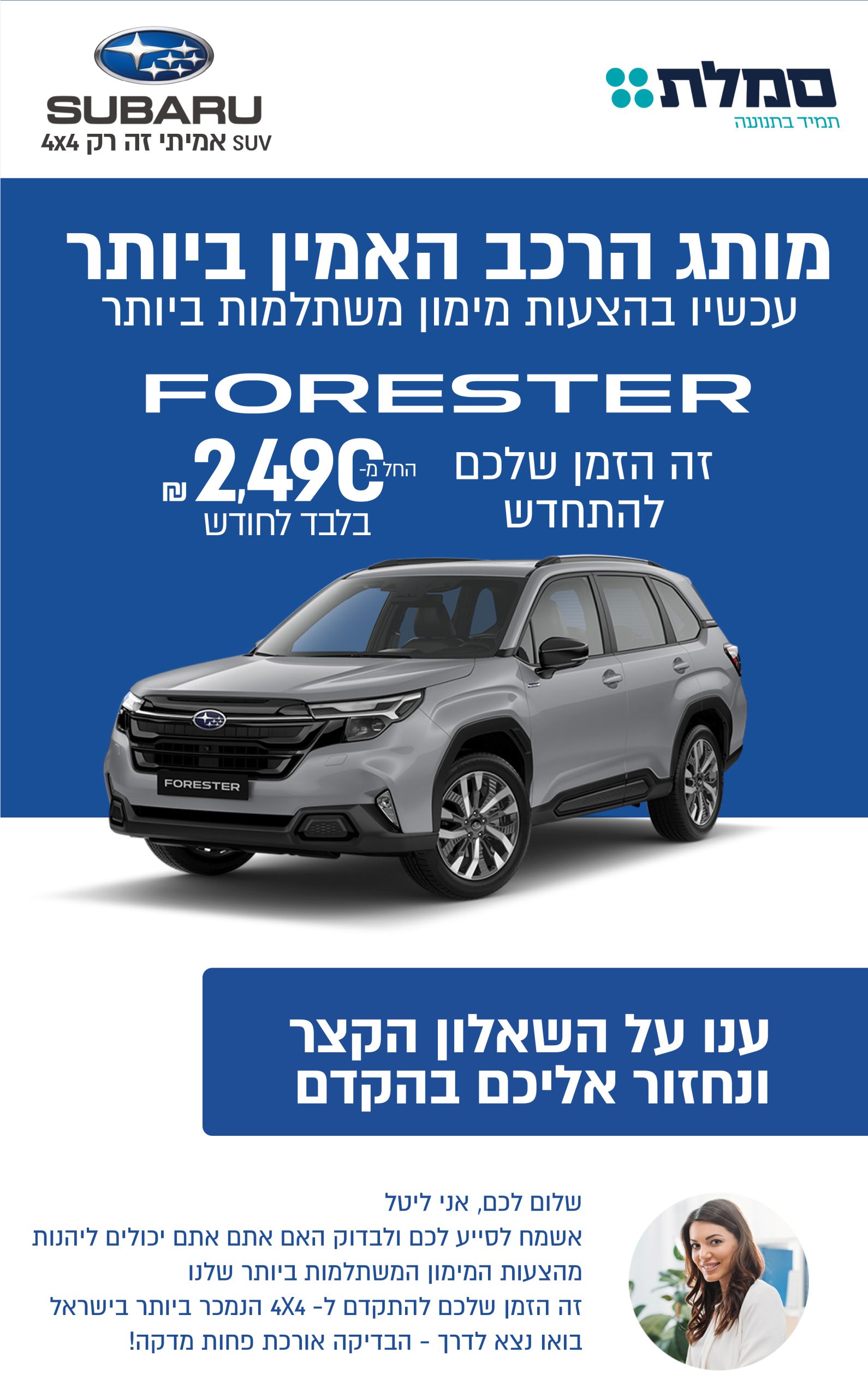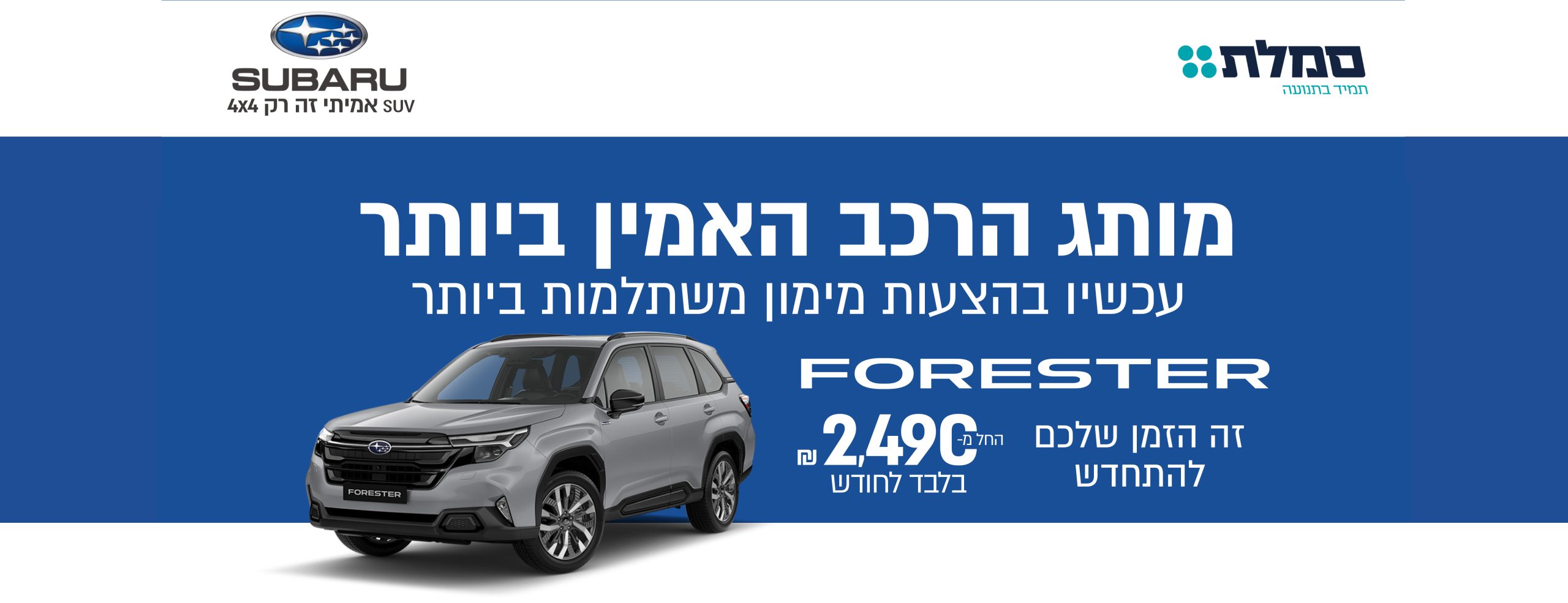 מחיר כולל א. רישוי 215,622 ₪ המחיר מתייחס לדגם FORESTER PREMIUM ג'נט רגיל לא כולל צבע מטאלי, המחיר אינו כולל אבזור ותוספות ע"פ מחיר מחירון 30/09/2025. צריכת הדלק בפועל מושפעת גם מתנאי הדרך, מתחזוקת הרכב ומאפייני הנהיגה ויכולה אף להגיע לפער משמעותי ביחס לנתוני המעבדה. הגורם המממן שומר על זכותו לשנות את תנאי המסלולים או לבטלם בכל עת. מסלול מימון 100% ומסלול חודשי הינו הלוואה ללקוחות שיאושרו מעל גיל 24 באמצעות גורמים מממנים צד ג', באחריותם ובכפוף להסכמתם ואישורם ועפ"י יתר תנאיהם ובטחונות נדרשים. עד- 99 תשלומים חודשיים בהוראת קבע , בתוספת מקדמה. בהלוואה עד 60 תשלומים בלבד אפשרות לתוספת תשלום בסוף תקופה . מבוסס על ריבית פריים + 2% (וכפוף לשינויים בריבית הפריים) או צמוד מדד + 4.4% ובתוספת עמלת הקמה של 1% מגובה ההלוואה בהלוואות מעל- 100,000 ₪ + דמי שעבוד בסך 370 ₪. לא כולל אגרת רישוי שתיווסף למקדמה. אי עמידה בפירעון ההלוואה עלול לגרום לחיוב בריבית פיגורים והליכי הוצאה לפועל. הגורם המממן שומר על זכותו לשנות את תנאי המסלולים או לבטלם בכל עת. מסלול ליסינג הינו עסקת החכרה ל- 36 חודשים של רכב הנותר בבעלות ועל שם החברה, כפוף לתשלום חד פעמי ראשון בסך 14,900 ₪ ו- 36 תשלומים חודשיים צמודים לשיעור עליית מדד המחירים לצרכן. תמחור זה תקף לנסיעה של 20,000 ק"מ בשנה לנהג מעל גיל 24 ורישיון מעל לשנה לפחות וכולל אגרת רישוי, ביטוח חובה, צד ג' ומקיף, טיפולי שגרה בהתאם להנחיות היצרן וספר הרכב במרכזי השירות של סמלת, ומיגון על פי דרישות הביטוח. כפוף לחיתום, אישור, בטחונות ויתר תנאי העסקה כפי שיפורטו בהסכם ככל וייכרת. אי השלמת תקופת העסקה כרוך בתשלום קנסות יציאה. החברה תהא רשאית להעביר את הרכב לחזקתה באופן מידי. צריכת הדלק בפועל מושפעת גם מתנאי הדרך, מתחזוקת הרכב ומאפייני הנהיגה ויכולה אף להגיע לפער משמעותי ביחס לנתוני המעבדה. הגורם המממן שומר על זכותו לשנות את תנאי המסלולים או לבטלם בכל עת. התמונה להמחשה בלבד. טל"ח subaru.co.il.