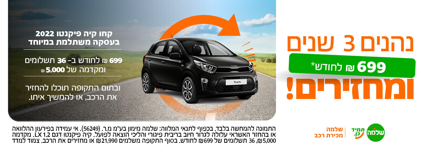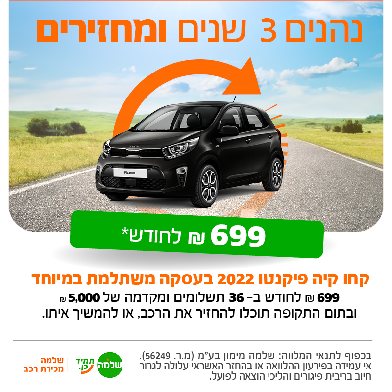 קיה פיקנטו 2022 ב- ₪699 לחודש ב- 36 תשלומים, בסיומם תוכלו להחזיר את הרכב או להמשיך איתו.